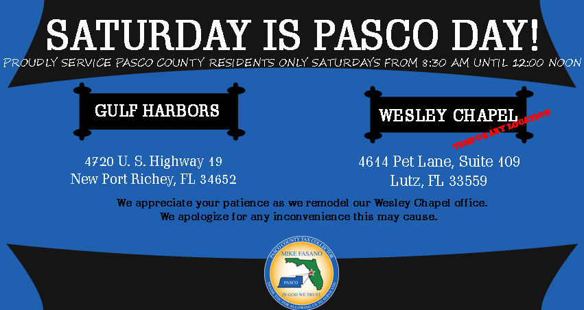 Tax Collector Mike Fasanos five offices will feature. Name New Port Richey Tax. Pasco County Tax Collectors Office at Gulf Harbors 4720 US-19 New Port Richey FL 34652.